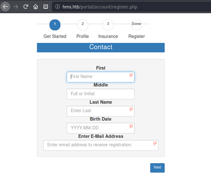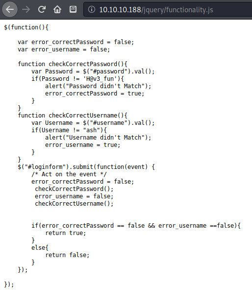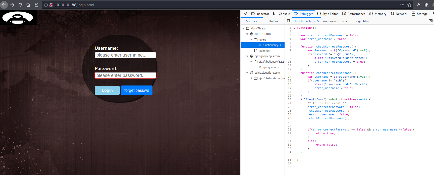I started my enumeration with an nmap scan of 10.10.10.188. The options I regularly use are: -p-, which is a shortcut which tells nmap to scan all ports, -sC is the equivalent to --script=default and runs a collection of nmap enumeration scripts against the target, -sV does a service scan, and -oN <name> saves the output with a filename of <name>.