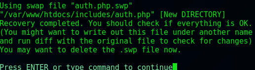 Using the -r flag for vim I was able to recover the file /var/www/htdocs/includes/auth.php from the .swp file.
