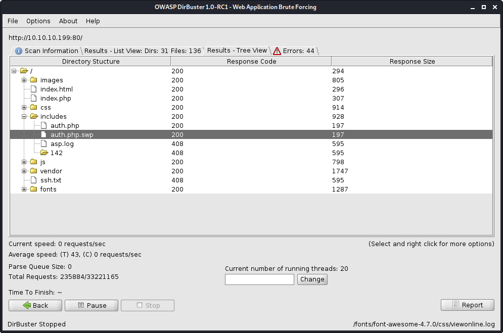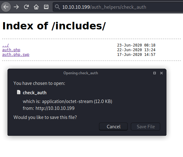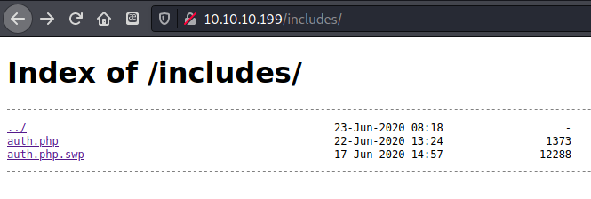 There wasn’t anything to do with the login page so I ran gobuster on it, there was an /includes folder where I was able to download the files auth.php and auth.php.swp. Auth.php didn’t have anything in it so I tried the .swp file instead.