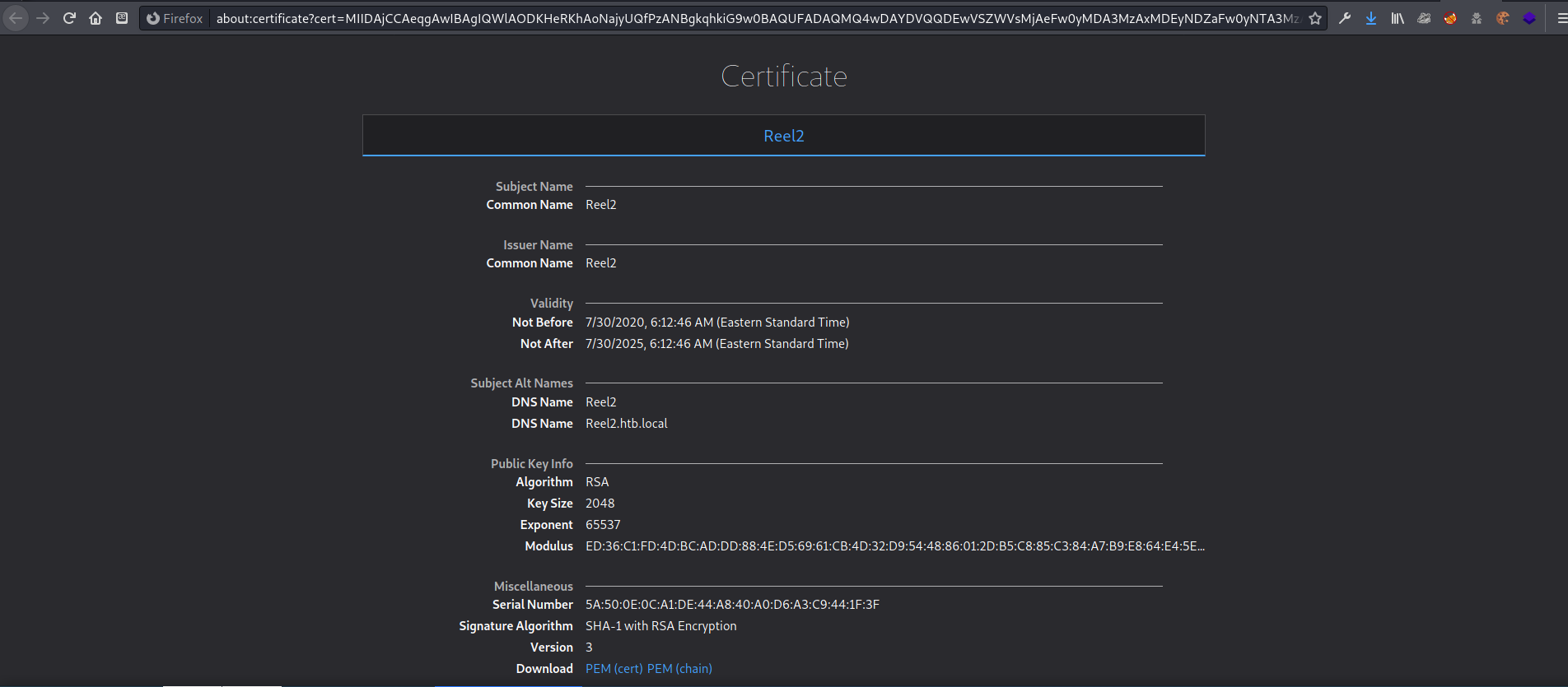 | Subject Alternative Name: DNS:Reel2, DNS:Reel2.htb.local