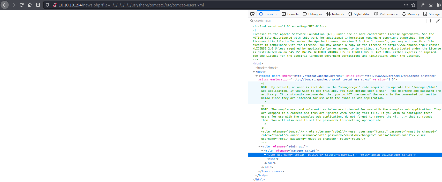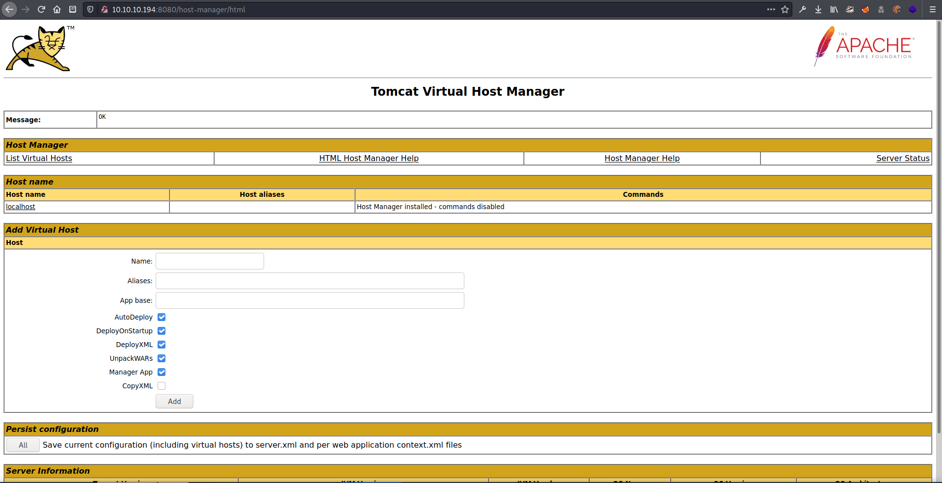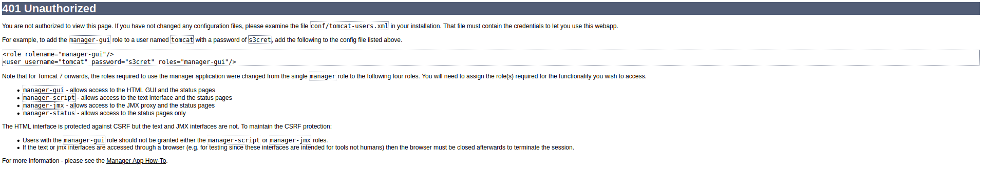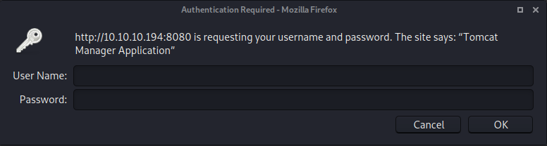 Putting in bad credentials redirected me to a very verbose 401 Unauthorized page. http://10.10.10.194:8080/docs/host-manager-howto.html