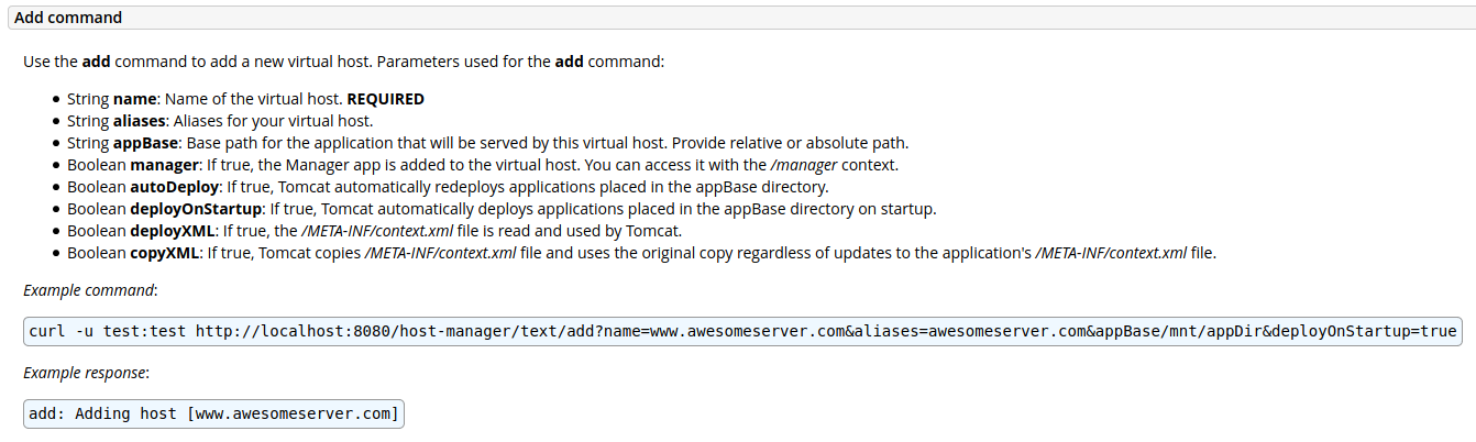 curl -u test:test http://localhost:8080/host-manager/text/add?name=www.awesomeserver.com&aliases=awesomeserver.com&appBase/mnt/appDir&deployOnStartup=true