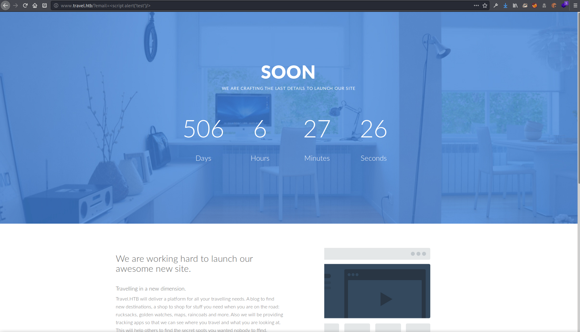 Connecting to www.travel.htb I found a “coming soon” type site with a countdown. On this site I found a contact information section with a potential a user email format.