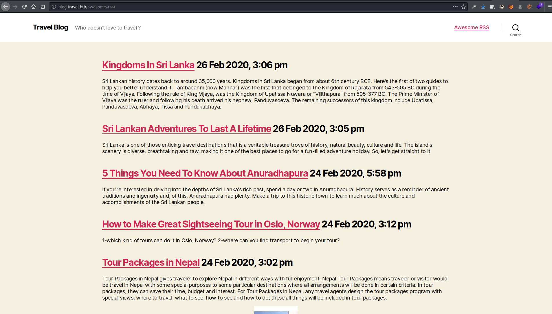 [+] WordPress readme found: http://blog.travel.htb/readme.html