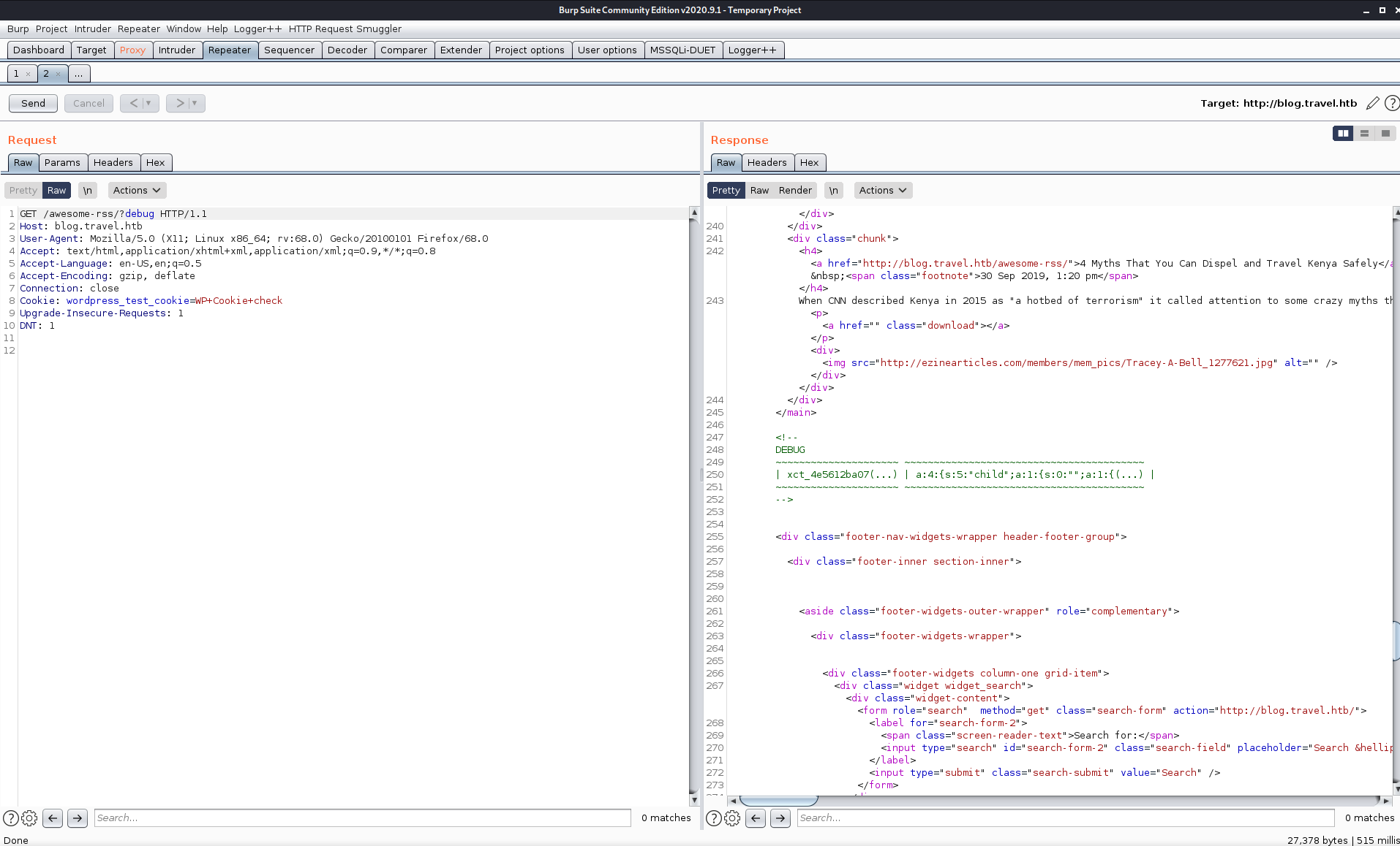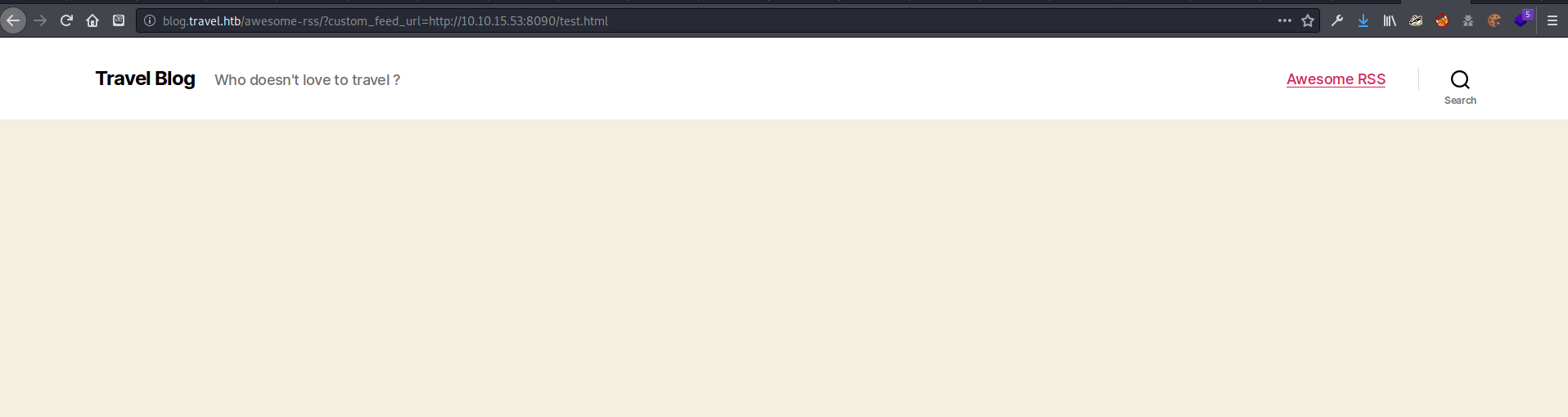 The Firefox plugin wappalyzer told me the site was using WordPress version 5.4. I fired up wpscan to check the site for vulnerabilities using the syntaxwpscan --url http://blog.travel.htb/ --enumerate.